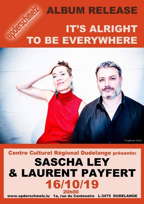 Sascha Ley et Laurent Payfert présentent l’art subtil du duo voix et contrebasse. Avec leurs affinités musicales mutuelles, la chanteuse, actrice et poète luxembourgeoise et son ami ouvrent les portes à un voyage sonore singulier qui allie improvisation libre, compositions écrites et instantanées et sonorités familières. Des paysages oniriques et suggestifs, de l’art narratif et l’utilisation de techniques vocales et instrumentales étendues créent une expérience sonore surprenante. ‘It’s Alright To Be Everywhere’, paru chez le label allemand JazzHausMusik, est leur deuxième album. Pour ce concert de présentation, Jean Pascal Boffo à la guitare et aux effets sonores et le pianiste Murat Öztürk, leurs deux invités de l’album, les rejoindront pour accompagner et créer quelques-unes des compositions. Avis aux amateurs de musique insolite et aventureuse.