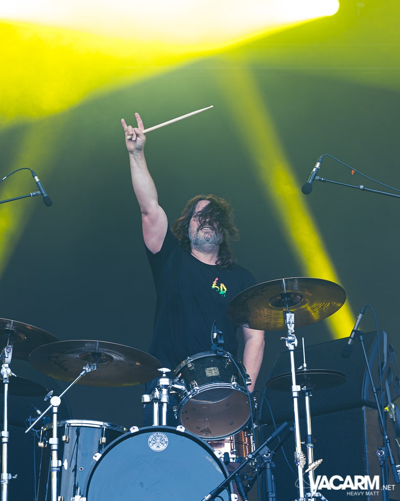 Eux aussi savent manier le second degré, Tenacious D débarque en haut de l’affiche à Clisson pour nous faire voyager dans son univers satyrique. Jack Black et Kyle Gass, les génies comiques derrière le duo, ont offert une performance énergique et parfois hilarante – débutant leur set sur “Kickapoo”. Parmi les moments forts du spectacle, Tenacious D interprète ses singles “Tribute” et “Video Games” et le duo réussit à tenir le public en éveil avec ses seules guitares acoustiques et accompagné d’un backing band. Tenacious D part en lutte épique face à Satan, gonflant une représentation grotesque de Belzebuth avant d’enchainer par “The Metal“. Jack Black et Kyle Glass s’affrontent à coups d’instruments-jouets, Jack optant pour un petit saxo tout rigolo, tandis que Kyle montre qu’il a la plus grosse en reprenant “Baker Street” de Gerry Raferty à l’aide d’un énorme tuba. Les forces du Mal seront défaites en fin de concert sur “Beelzeboss”, pour permettre à Jack Black de faire chanter “Fuck Her Gently” en choeur à une foule excitée.