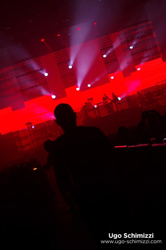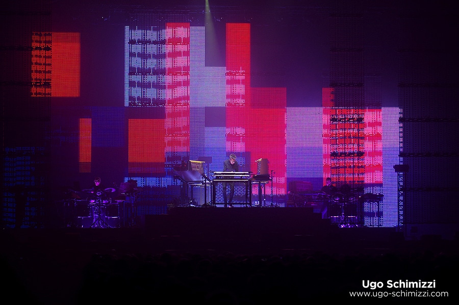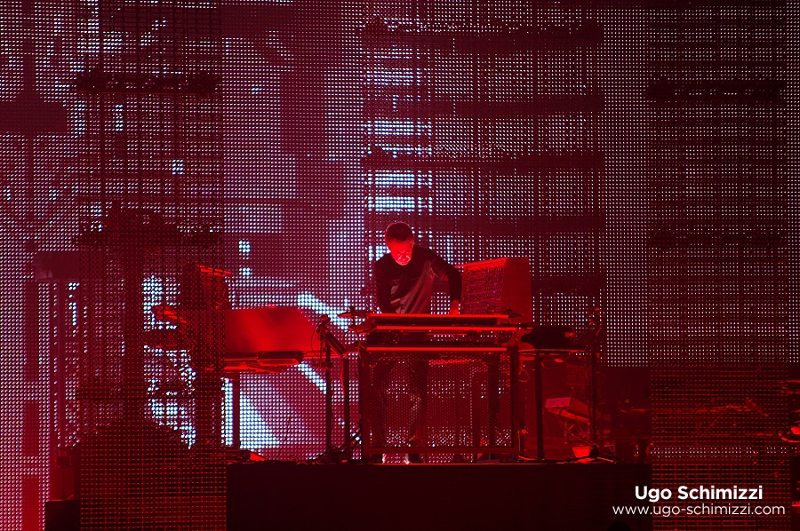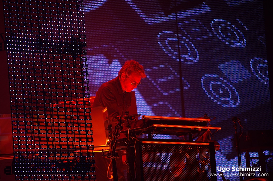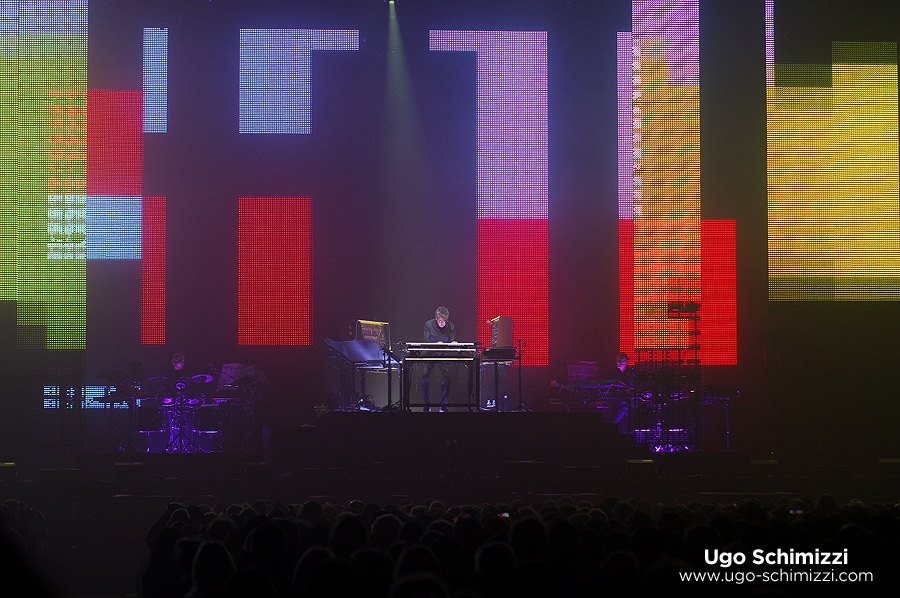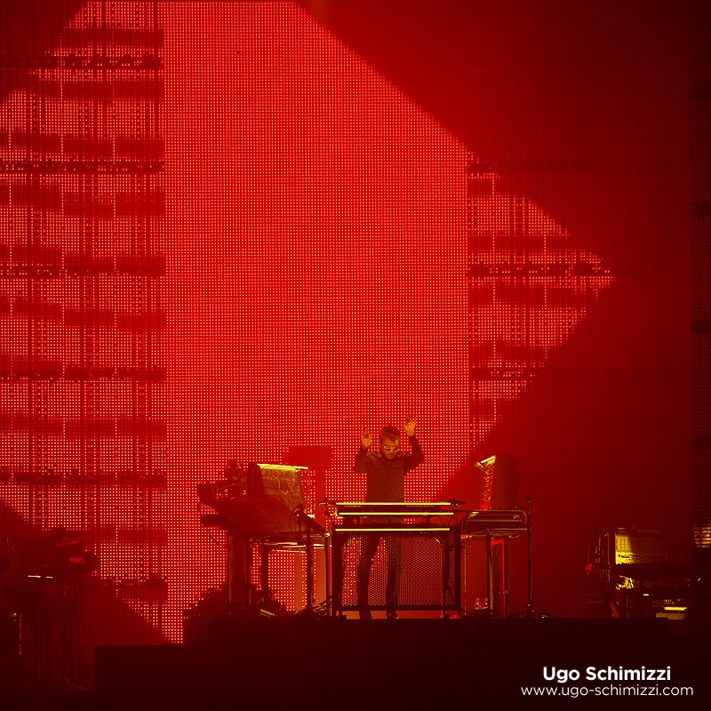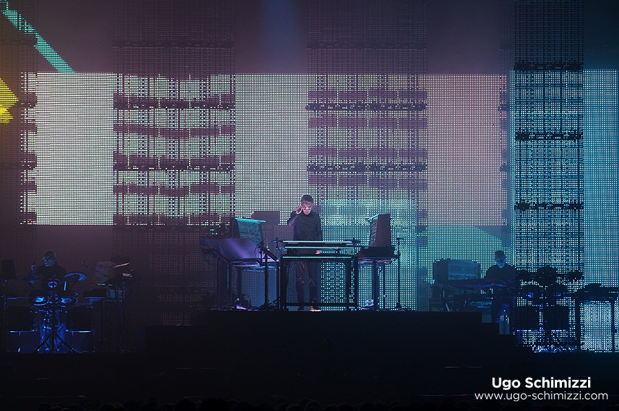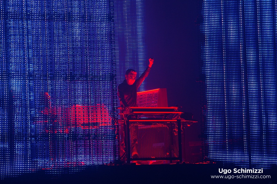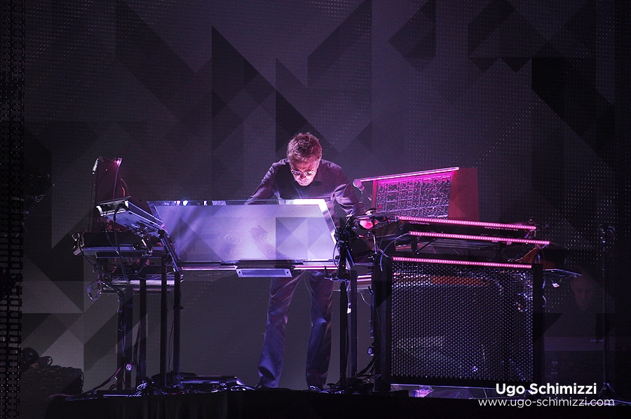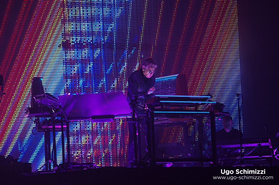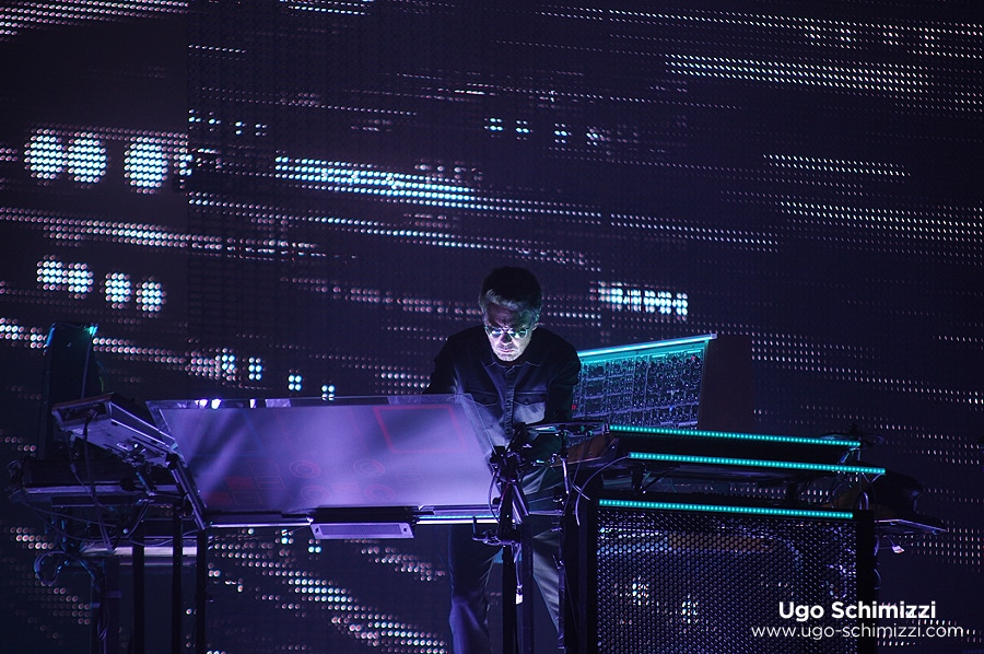 En première partie, Marco Grenier avait créé une atmosphère propice à l’arrivée du grand maître, distillant un set entre rythmes planant et envolées plus stimulantes. C’est après « 30 minutes d’entracte » généreusement offertes par la salle que l’homme aux 80 millions de disques vendus a fait son entrée, précédée par sa scénographie imposante. Celle-ci, composée d’une armature métallique placée devant les machines de l’artiste, mouvante, a largement contribué pour ce concert encore, à l’ambiance et à l’univers du musicien.