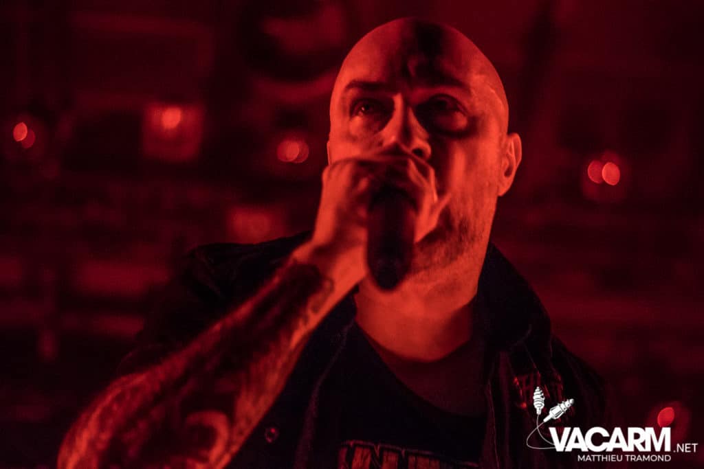 Les Belges de la soirée ne sont pas là pour rigoler puisqu’ils officient dans le brutal death metal. Le décor de la scène est à l’image de leur univers horrifique avec deux têtes ornant la batterie tel un sacrifice aux dieux du blast beat. Sur scène deux caissons de verre exposent respectivement un squelette baignant dans la lumière.