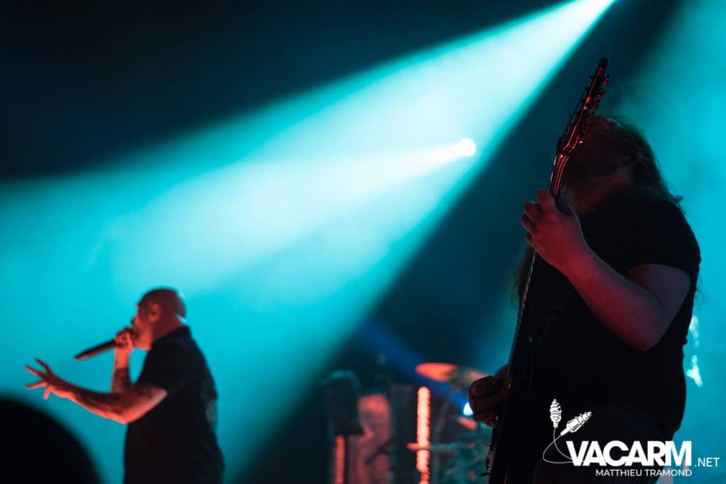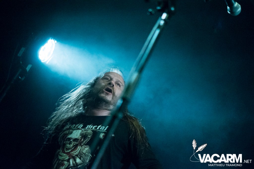 Musicalement les compos s’apparentent à un death metal assez rugueux presque rock garage dans son approche. Si la mise en scène est tout en sobriété, le jeu de lumière agrémente parfaitement les morceaux par ses couleurs claires et chaleureuse à l’image de la bonne humeur se dégageant sur scène. Évidemment Simon Olsen est de retour pour pousser la chansonnette et réalise ce soir un triplet en ayant été présent sur les 3 concerts de la soirée.
