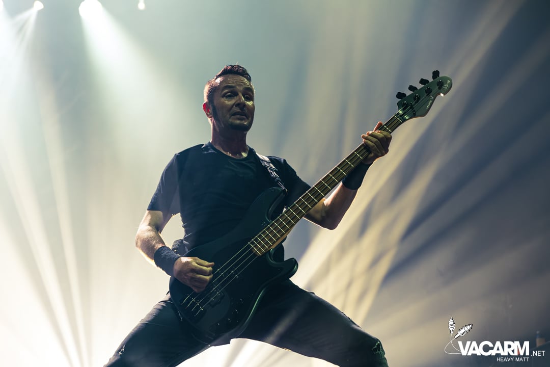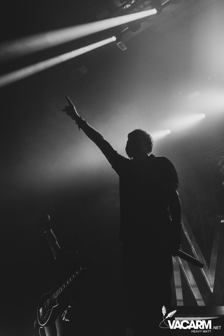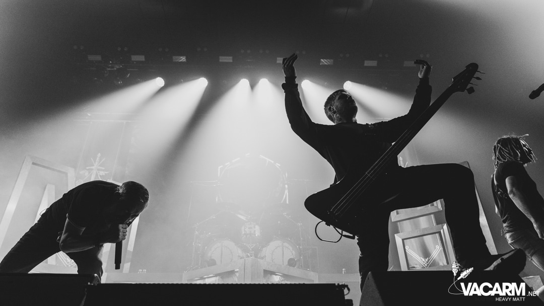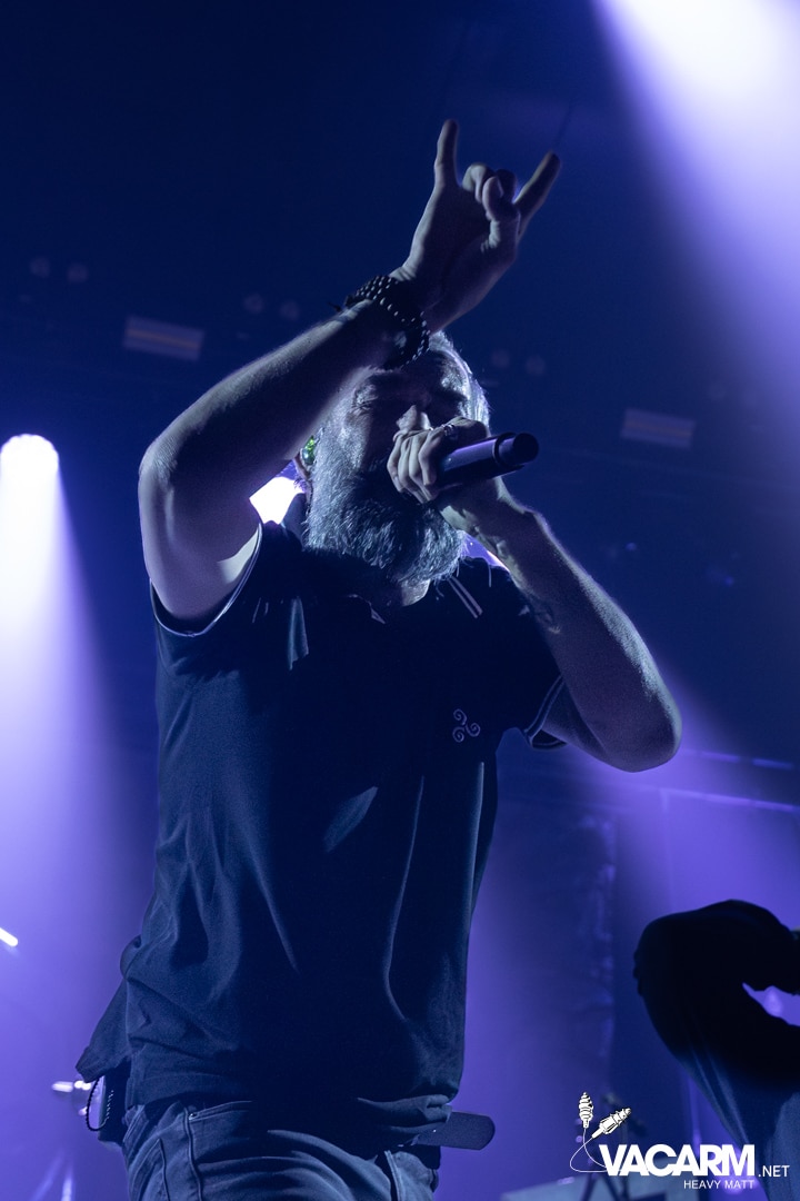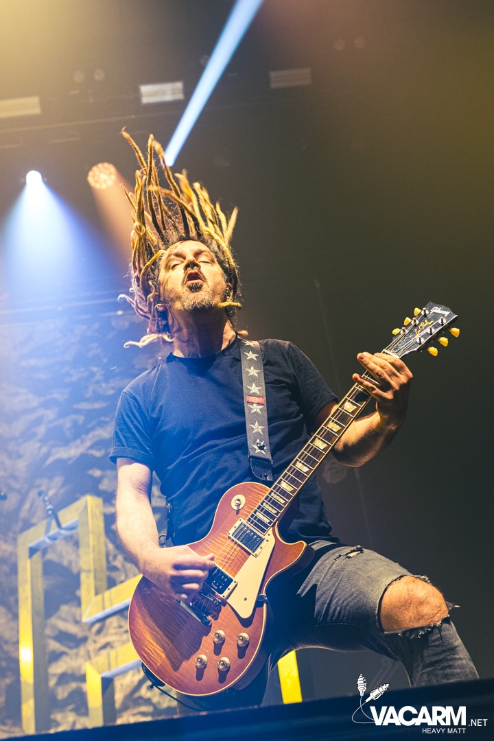 Nouveau changement d’ambiance : la scène se vide et laisse place au décor imposant de Mass Hysteria. Non content de la claque reçue il y a quelques semaines au Bikini de Ramonville, nous sommes ravis de recroiser Mouss et sa bande dans une salle toujours remplie à bloc. Après une intro aux sons alarmants, c’est Mass Veritas qui déchaine les premières notes et fait s’activer les premières nuques.