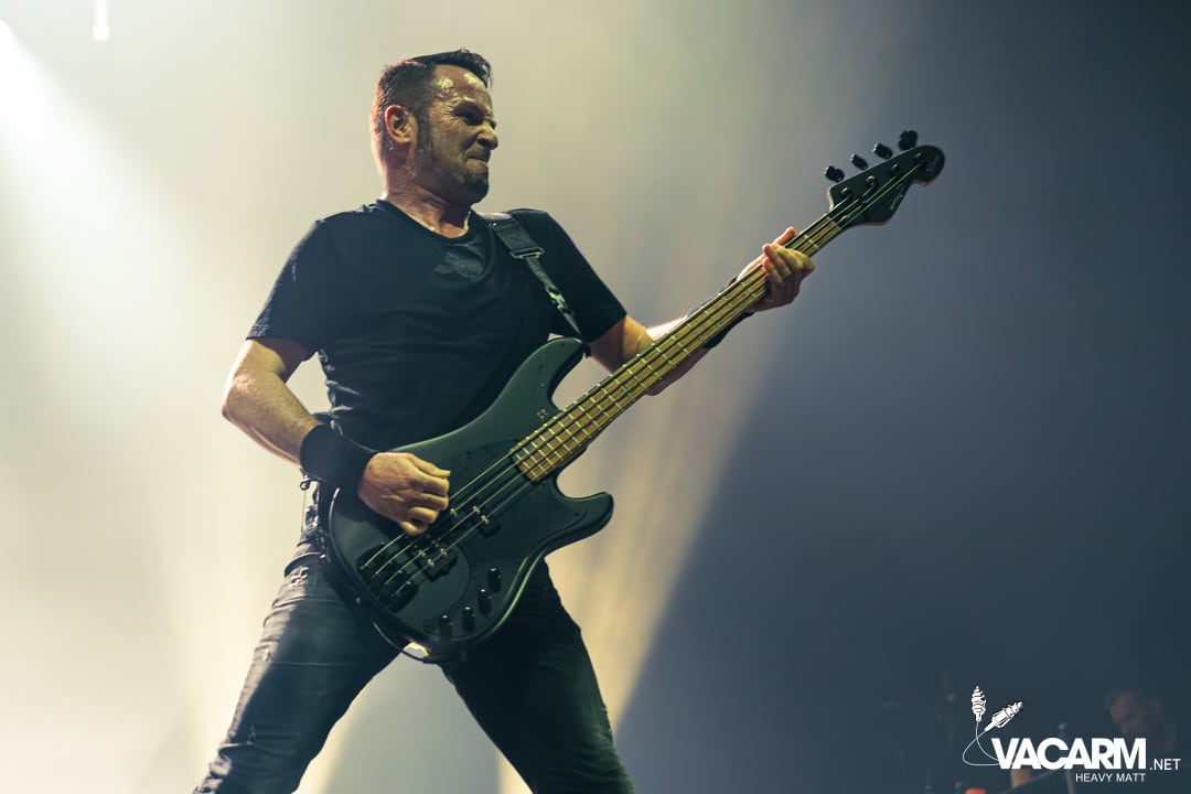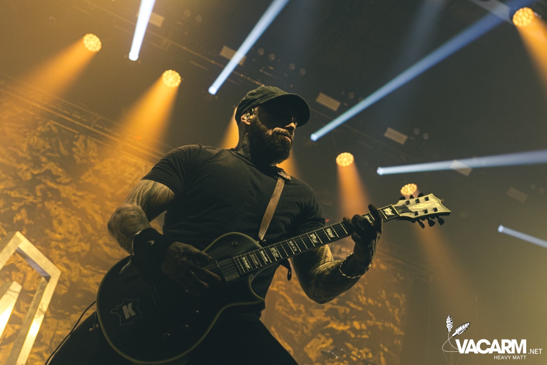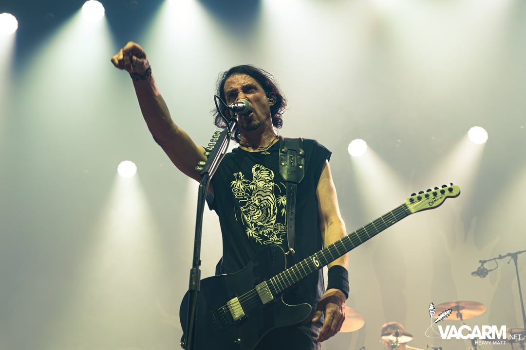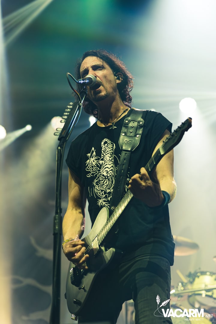 Nouveau changement d’ambiance : la scène se vide et laisse place au décor imposant de Mass Hysteria. Non content de la claque reçue il y a quelques semaines au Bikini de Ramonville, nous sommes ravis de recroiser Mouss et sa bande dans une salle toujours remplie à bloc. Après une intro aux sons alarmants, c’est Mass Veritas qui déchaine les premières notes et fait s’activer les premières nuques.