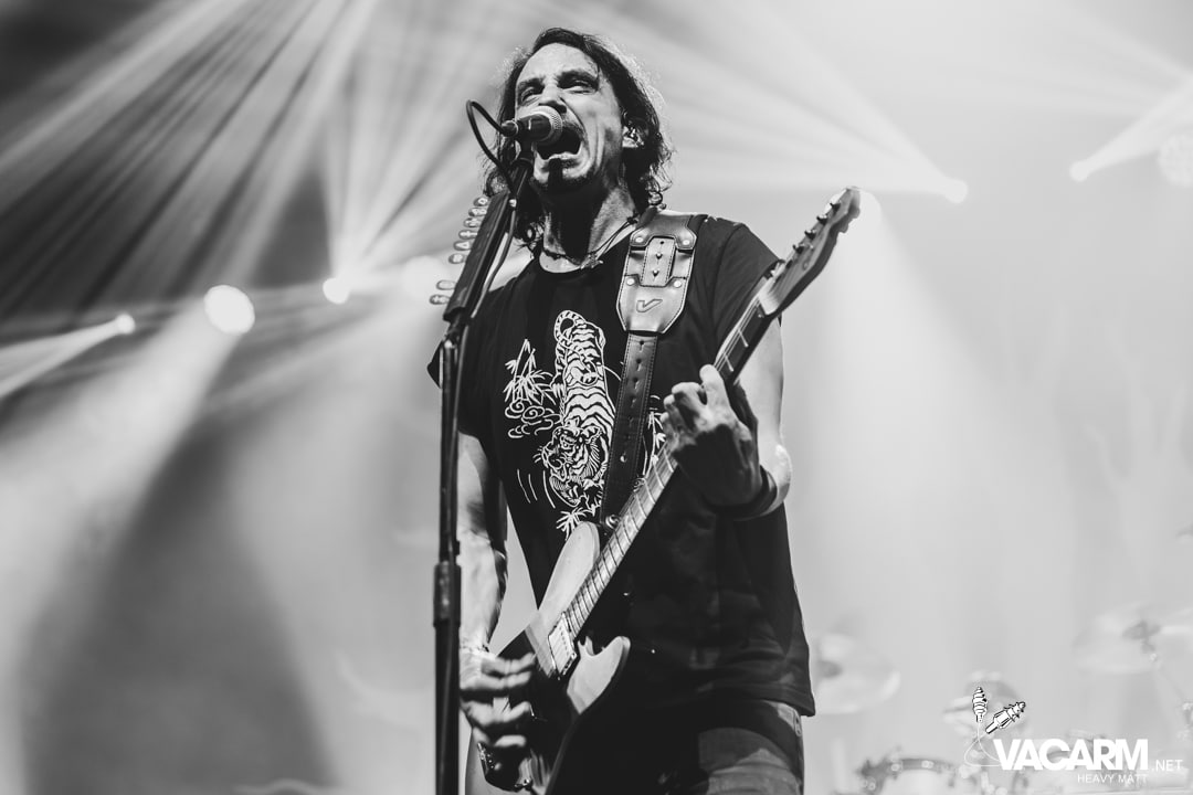 C’est d’ailleurs sur cette même chanson qu’il monte sur scène. Le son est excellent, la double de Mario martyrisent nos tympans sur une lumière d’un bleu abyssale. Sans remonter à la surface, on enchaine direct avec le tubesque Silvera. Malgré l’absence des écrans et autres éléments de décors immersifs que l’on a pu voir sur la tournée du groupe en 2023, la présence des quatre musiciens suffit à mettre l’ambiance.