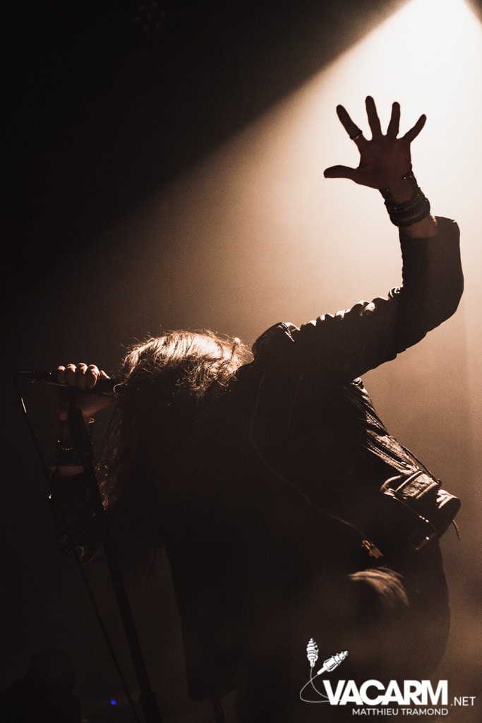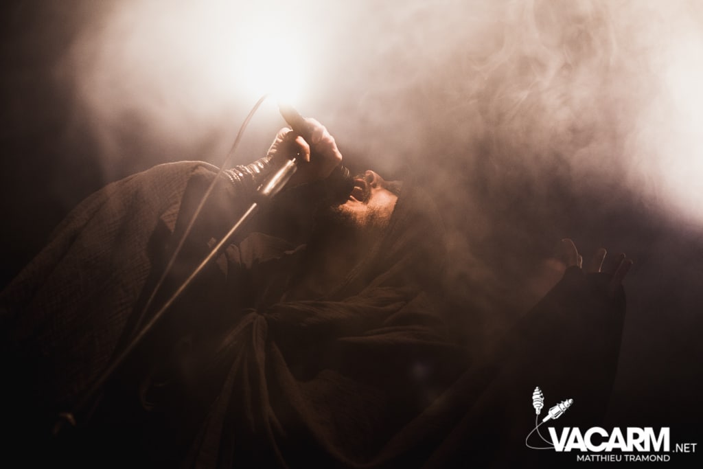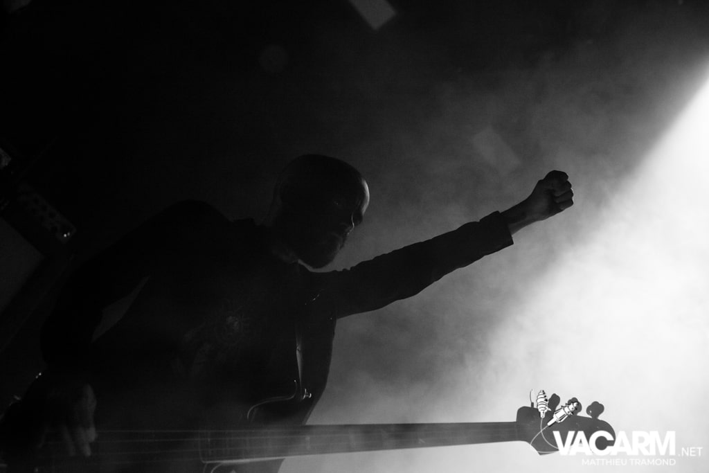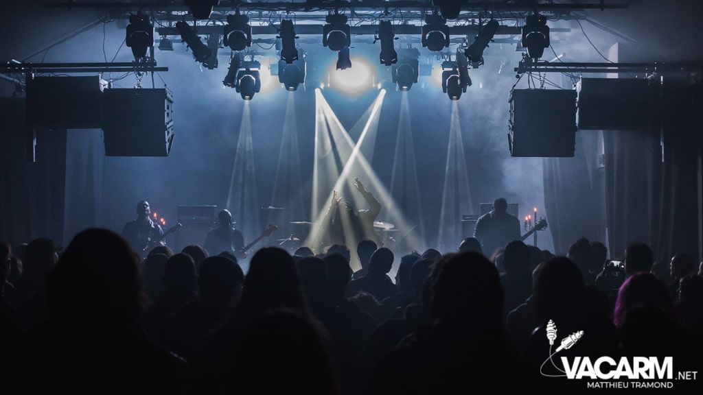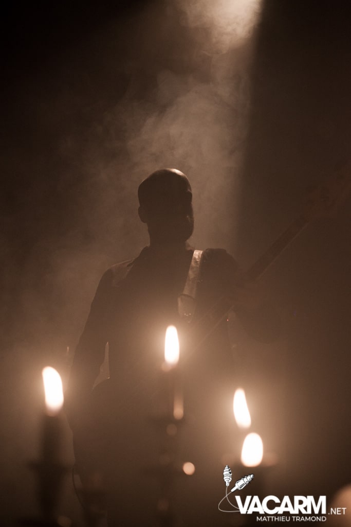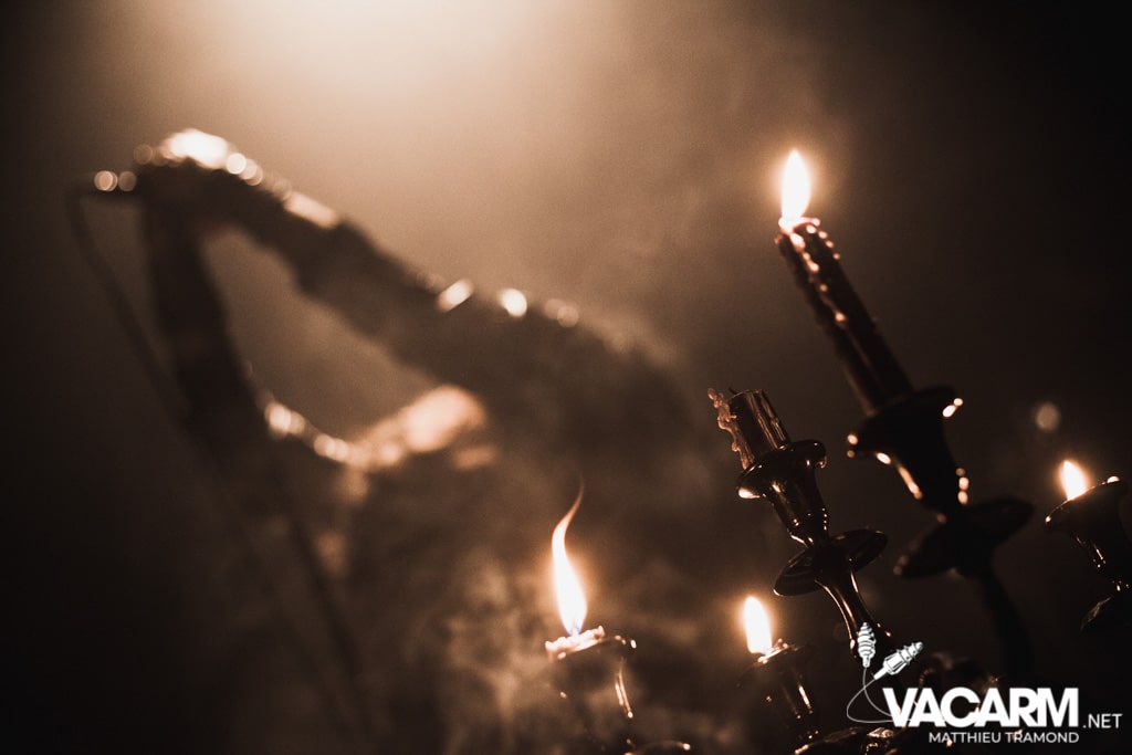 Ambiance tamisée pour la tête d’affiche de la soirée. Alors que l’odeur d’encens envahit le Rex, sur scène une étrange fumée voile la scène parsemée de chandeliers. Si la musique de Regarde Les Hommes Tomber est intransigeante, le show (ou plutôt devrais-je dire la cérémonie) de ce soir n’a en rien été laissé au hasard. Le jeu de lumière proposé par le groupe couplé aux effets de fumée a transcendé leur musique. Leur dernier opus Ascension est déjà sortie depuis l’an dernier mais à l’instar de nombreux groupes, ce n’est que maintenant qu’ils peuvent le défendre et pour le coup ils ne se sont pas gênés ! L’opus est tout simplement joué en quasi intégralité et visiblement ce n’est pas pour déplaire à l’assistance tant les headbangs du public, massé à la crash barrière, fouette les photographes de leur chevelures !