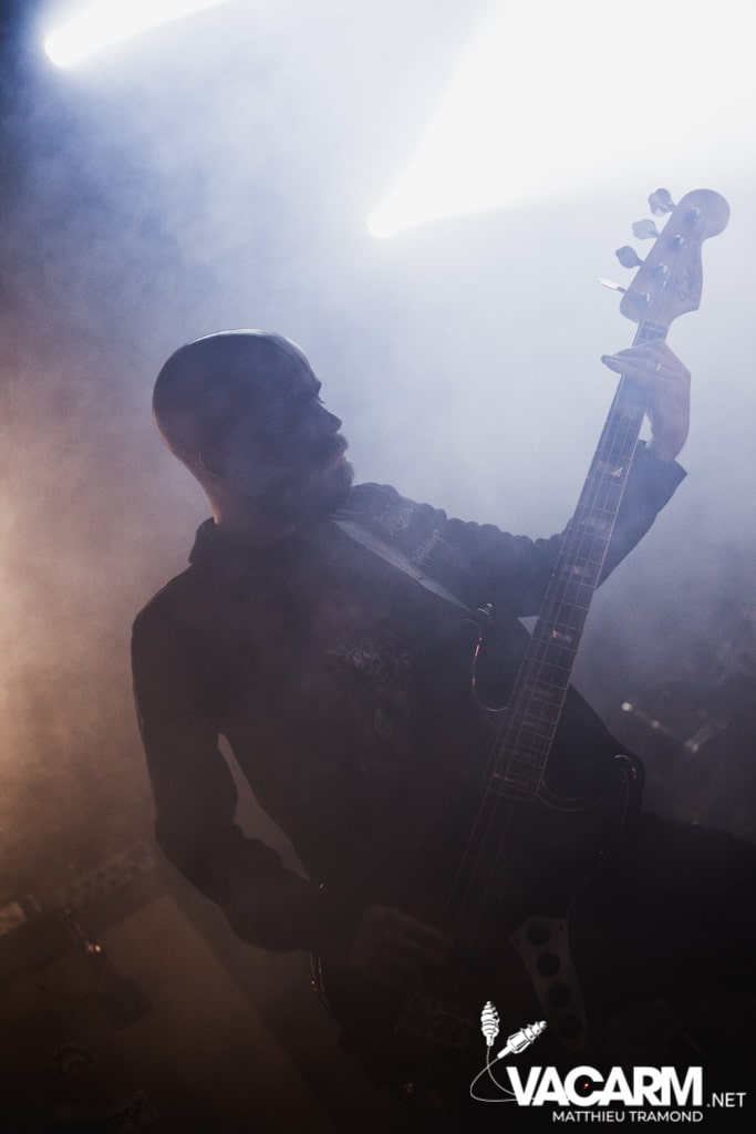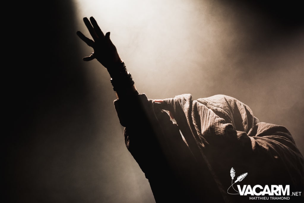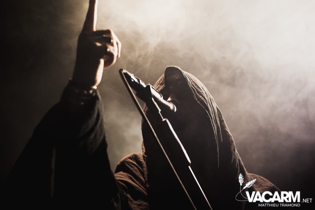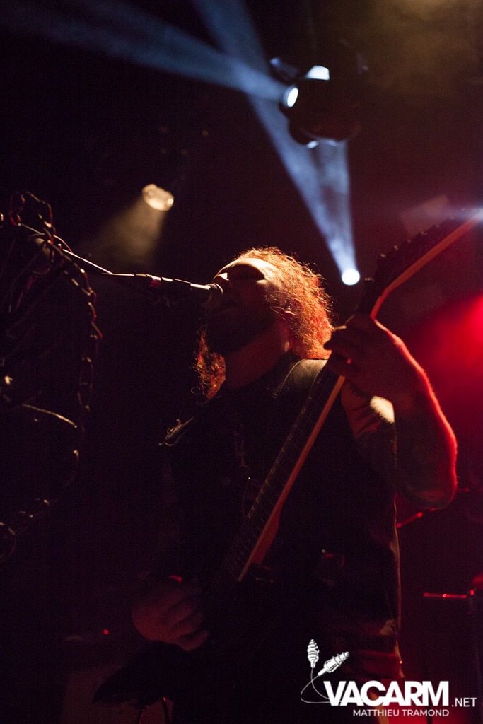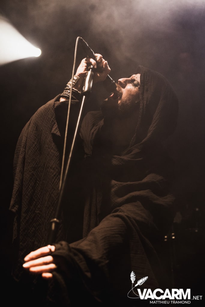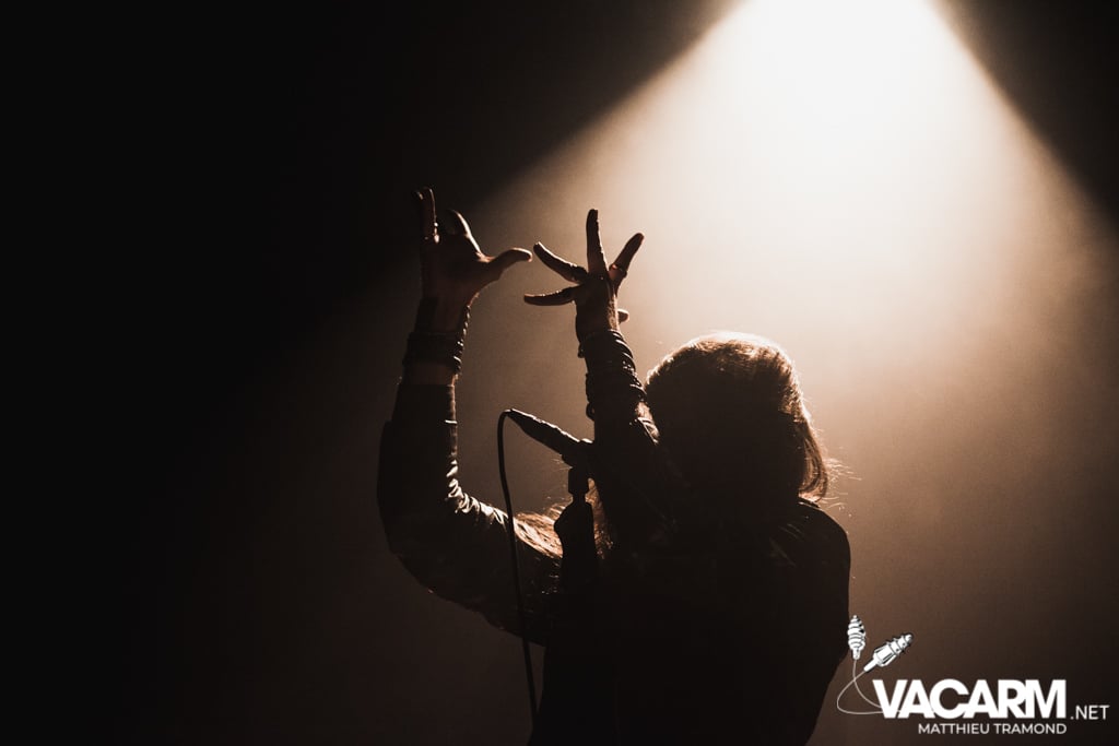 Ambiance tamisée pour la tête d’affiche de la soirée. Alors que l’odeur d’encens envahit le Rex, sur scène une étrange fumée voile la scène parsemée de chandeliers. Si la musique de Regarde Les Hommes Tomber est intransigeante, le show (ou plutôt devrais-je dire la cérémonie) de ce soir n’a en rien été laissé au hasard. Le jeu de lumière proposé par le groupe couplé aux effets de fumée a transcendé leur musique. Leur dernier opus Ascension est déjà sortie depuis l’an dernier mais à l’instar de nombreux groupes, ce n’est que maintenant qu’ils peuvent le défendre et pour le coup ils ne se sont pas gênés ! L’opus est tout simplement joué en quasi intégralité et visiblement ce n’est pas pour déplaire à l’assistance tant les headbangs du public, massé à la crash barrière, fouette les photographes de leur chevelures !