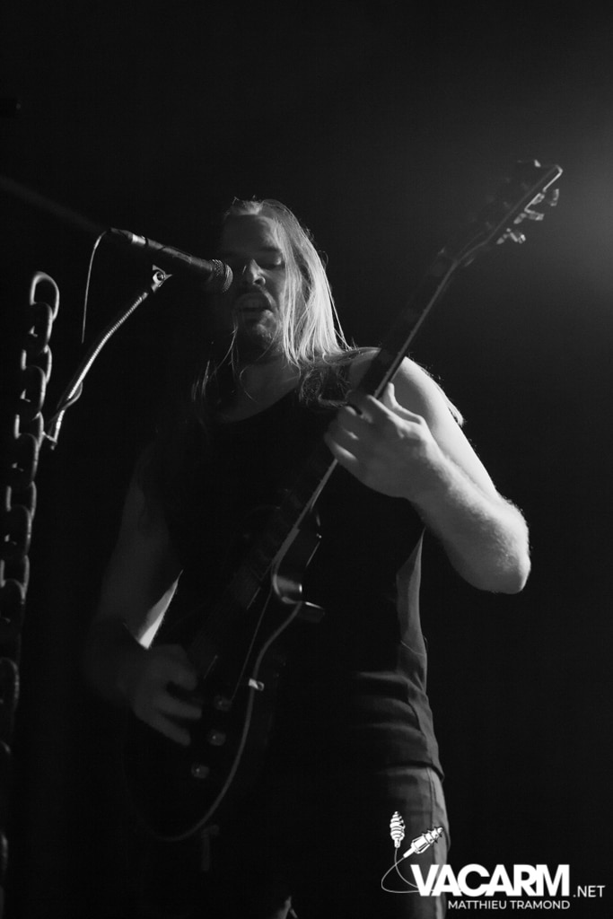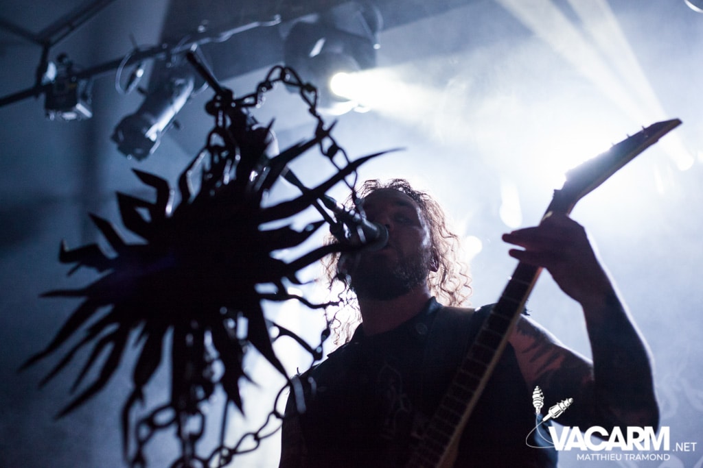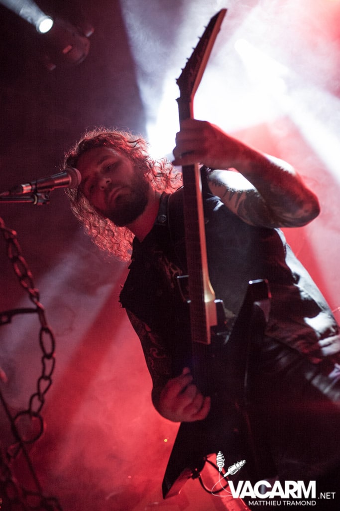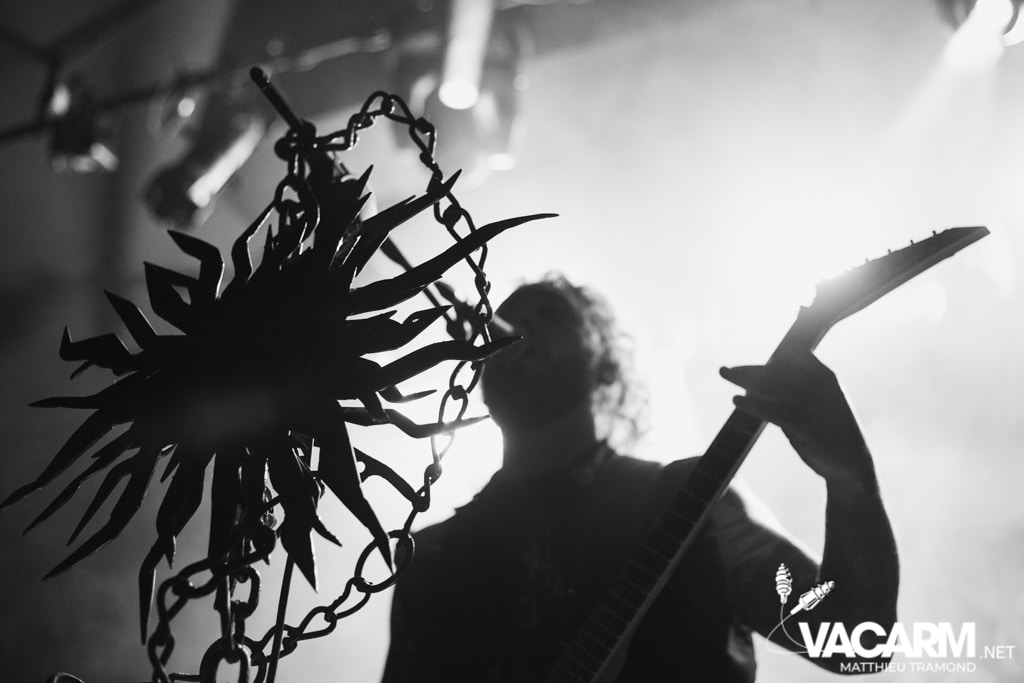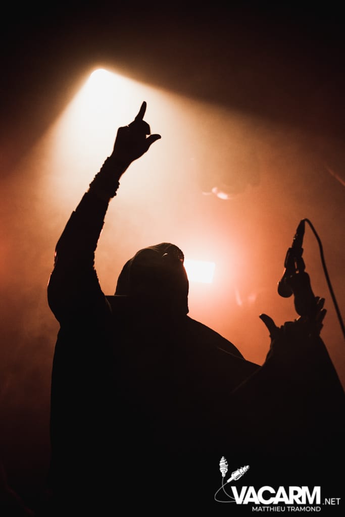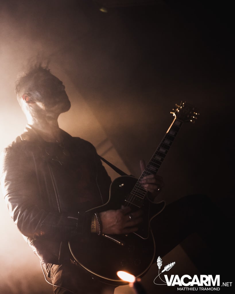 Ambiance tamisée pour la tête d’affiche de la soirée. Alors que l’odeur d’encens envahit le Rex, sur scène une étrange fumée voile la scène parsemée de chandeliers. Si la musique de Regarde Les Hommes Tomber est intransigeante, le show (ou plutôt devrais-je dire la cérémonie) de ce soir n’a en rien été laissé au hasard. Le jeu de lumière proposé par le groupe couplé aux effets de fumée a transcendé leur musique. Leur dernier opus Ascension est déjà sortie depuis l’an dernier mais à l’instar de nombreux groupes, ce n’est que maintenant qu’ils peuvent le défendre et pour le coup ils ne se sont pas gênés ! L’opus est tout simplement joué en quasi intégralité et visiblement ce n’est pas pour déplaire à l’assistance tant les headbangs du public, massé à la crash barrière, fouette les photographes de leur chevelures !