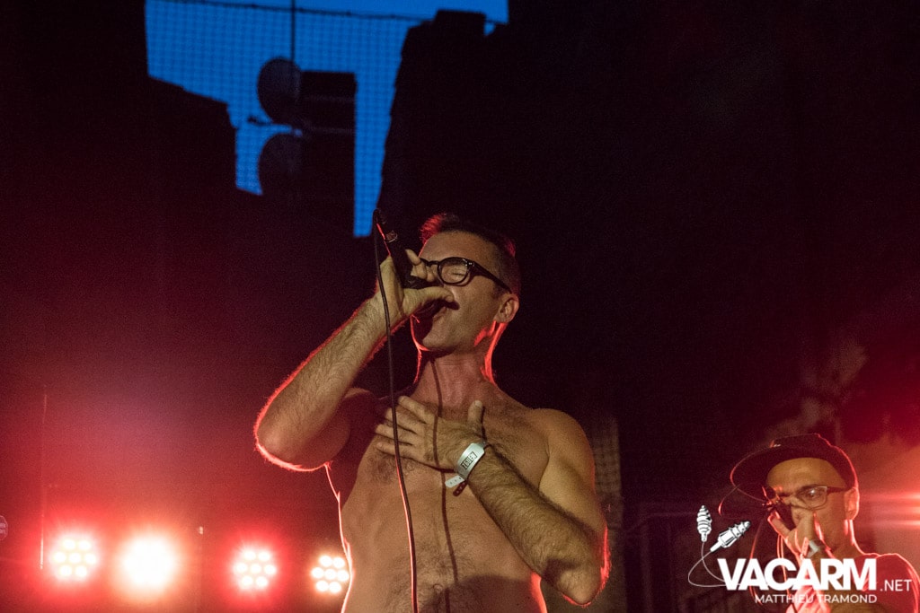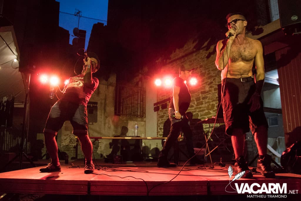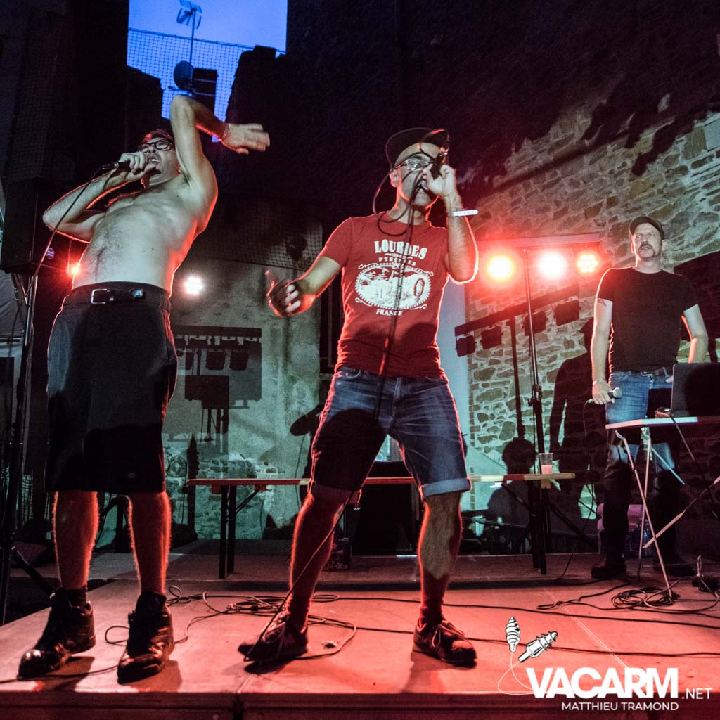 Les punks-rappeurs du 47 assurent le show pendant le changement de plateau de la scène principale. Oui chez Pollux on n’aime pas trop le silence alors entre deux groupes on en fait jouer un autre à côté du bar, d’ailleurs le bar est aussi à côté de la grande scène, généralement ça fait un bon point de repère ! Engagé à leur manière, les membres de Astaffort Mods, scandent leurs textes à tour de rôle, se partageant le micro quand ils ne chantent pas à l’unisson sur le refrain. Sous leurs allures de blague potache cette version Occitane de Sleaford Mods est plus subtile qu’elle n’en a l’air. Rapports campagne/citadin, la technologie ou autre question existentielle tel que le secret des coins à champignons sont leurs sujets de prédilection. Une curiosité que le public semble apprécier et tant mieux car un deuxième set est prévu dans la soirée.