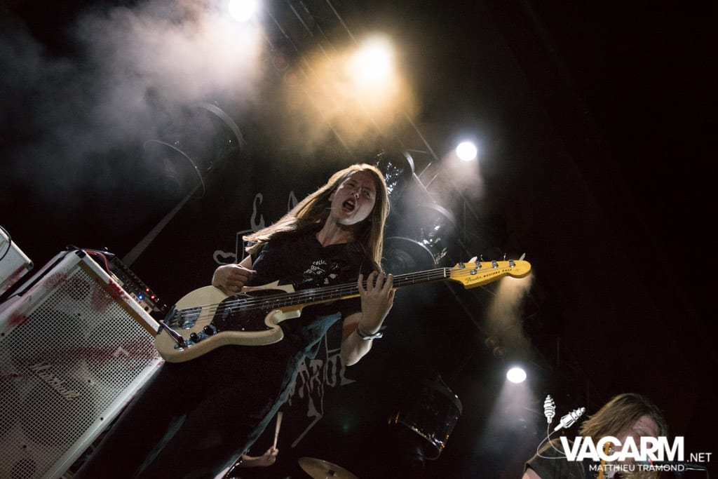 Après le second set des 3 MC de Astafforts Mods, c’est au tour de la tête d’affiche de monter sur la scène du Zguen Fest. Avec une courte intro Pogo Car Crash Control décide d’entamer son set par L’Odeur de la mort qui n’est autre que le premier morceau du nouveau disque sorti aujourd’hui (encore un truc à fêter ce soir !). Une parfaite entrée en matière pour ce set très axé sur le nouvel opus qui sera quasi intégralement joué (11 titres sur 12). Pour les retardataires la chronique de ce fabuleux condensé de grunge-punk-rock-metal est toujours disponible ici. P3C a voulu faire un album plus metal et impossible de le nier cela se ressent vraiment en live avec des titres comme Seul à Tomber ou Qu’est-ce qui va pas ? sur lequel Olivier peut exprimer sa nouvelle palette vocale qui sied à merveille les nouvelles compositions très très lourdes du groupe, car oui maintenant Monsieur scream et ça le fait. Petite mention pour Miroir sur lequel le riff de guitare de malade de Simon est parfaitement retranscrit, simplement génial. Louis à la batterie se fait particulièrement plaisir et martyrise ses fûts d’un plaisir coupable, enfin impossible d’ignorer Lola qui impressionne par son énergie dévastatrice sur scène. Actualité oblige, le groupe en profitera pour lancer un Covid of Death, nouvelle version du Wall of Death sur lequel nous devons nous arrêter avant de rentrer en contact avec notre voisin… théoriquement. Un concert de malade sur lequel les morceaux de Tête Blême ont mis tout le monde d’accord. Que dire de plus si ce n’est que Pogo a délivré l’intensité d’un tournée entière en une seule date !