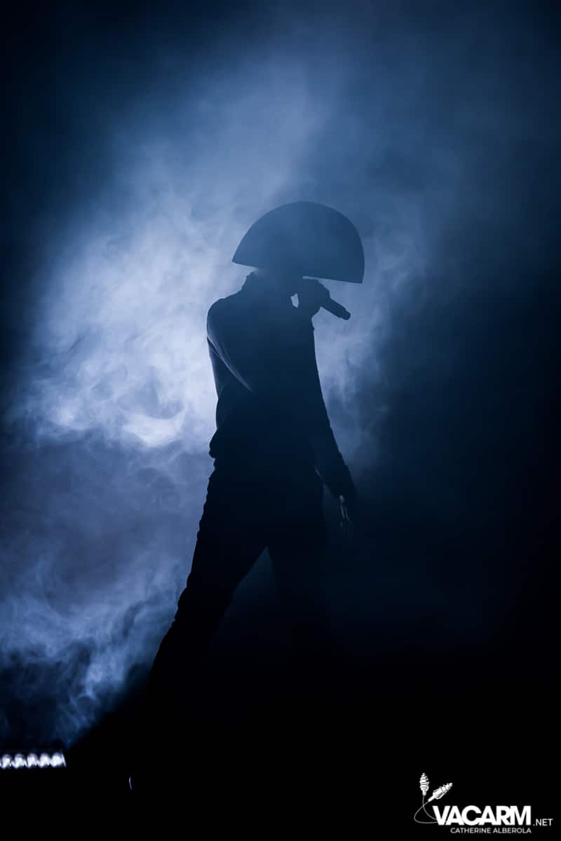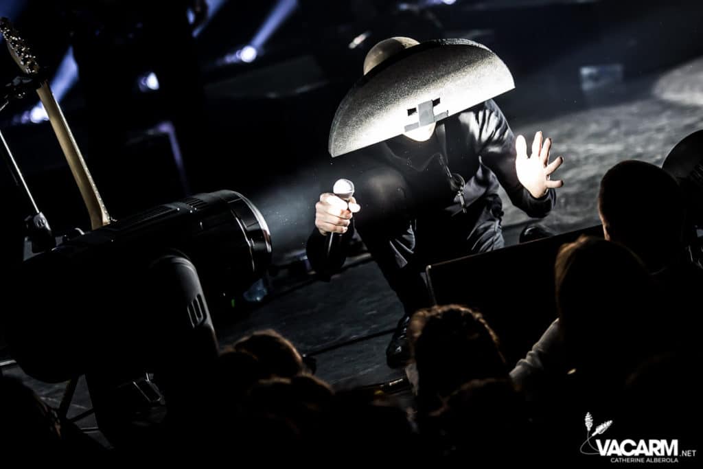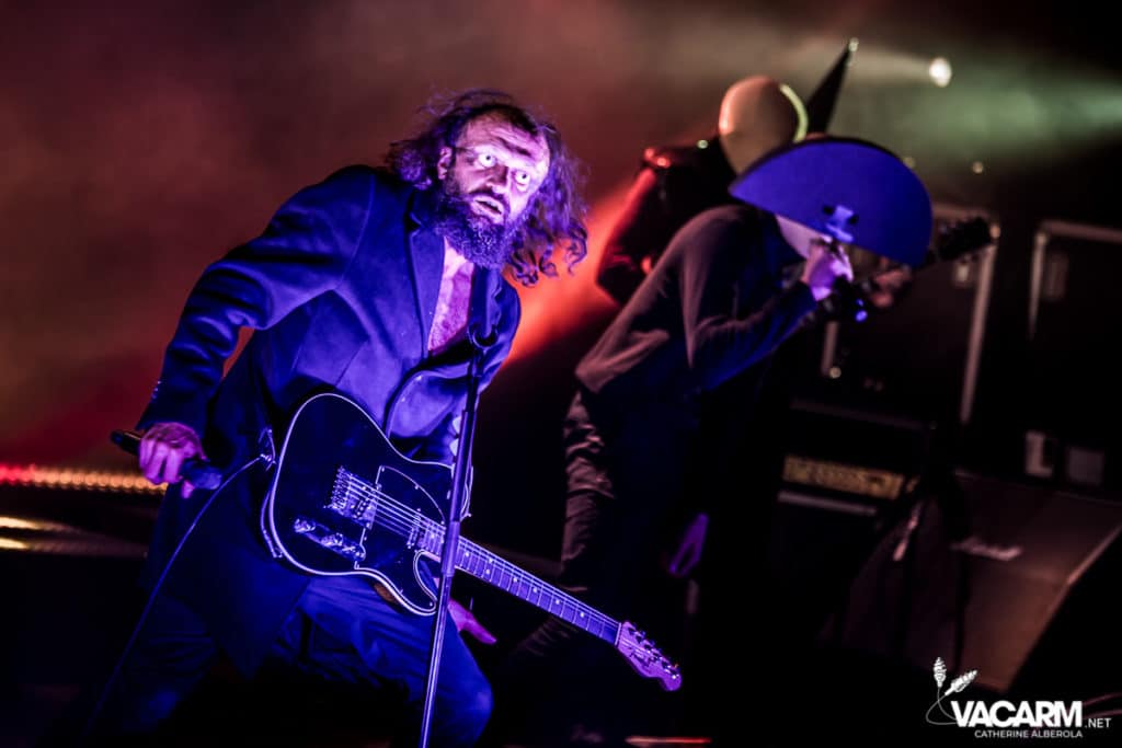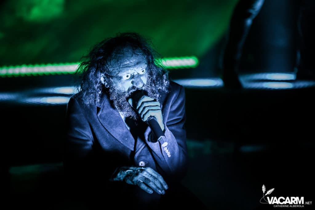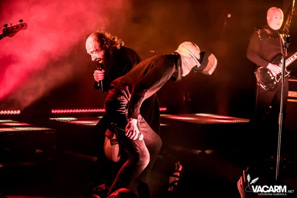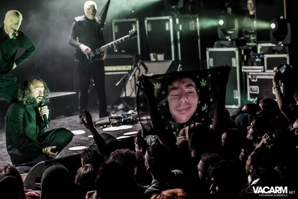 Les titres s’enchainent sans aucun temps mort, après « l’Umour Fou », Cadillac va “présenter l’orchestre” avant d’attaquer « Fer » et un pot-pourri Stupeflip, l’occasion de constater à quel point le truc est vivant dans les têtes des adeptes qui connaissent tous les couplets par coeur. Il se saisit de temps en temps de sa guitare électrique pour se joindre aux bassiste et guitariste stoïques en fond de scène sous leur cagoule alors qu’il doit faire dans les 40° dans la salle et le concert prend parfois des sonorités très punk/rock. Après « Originul » le groupe disparaît.