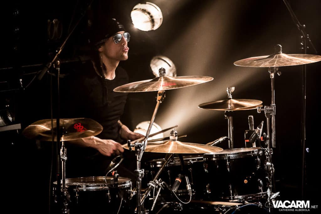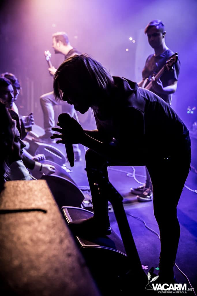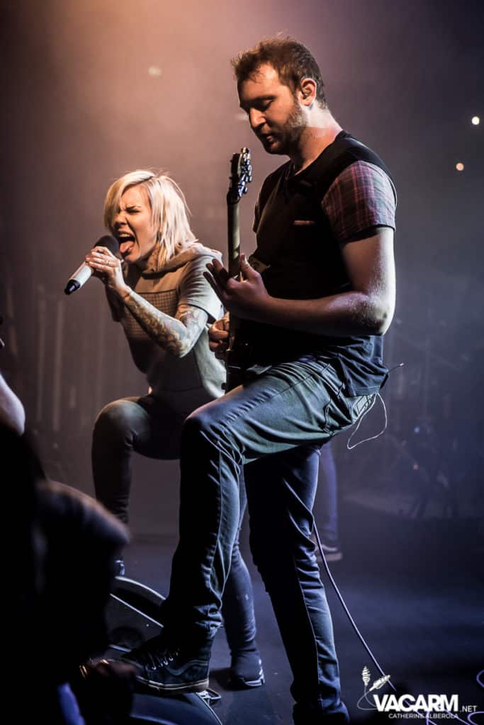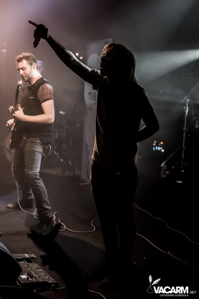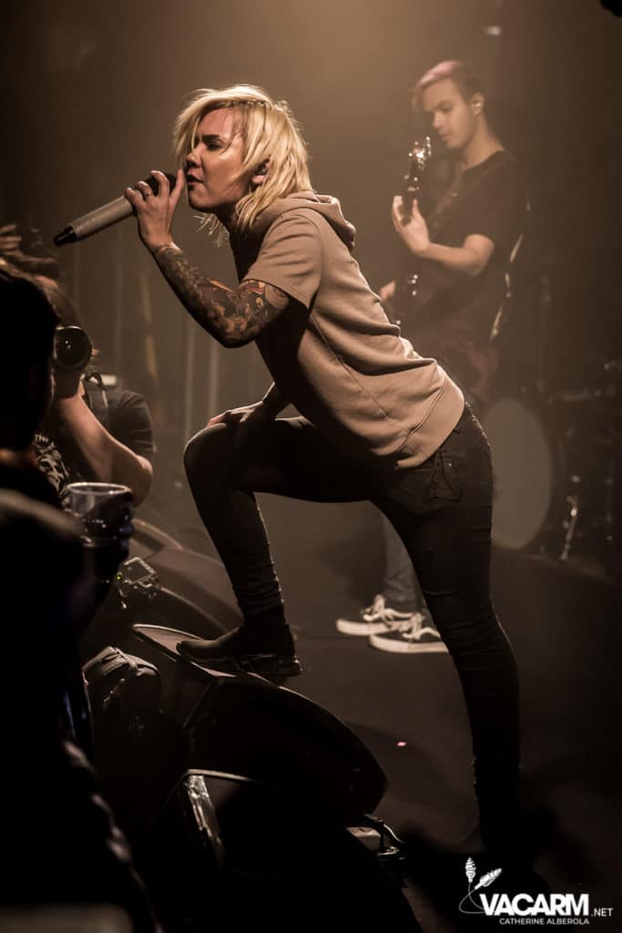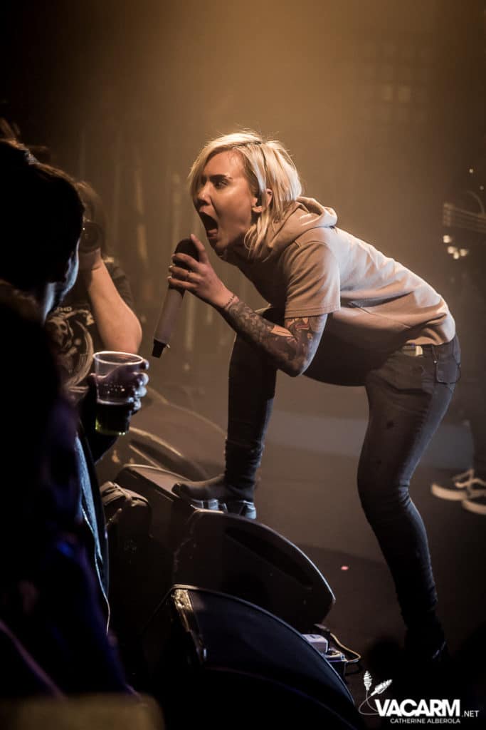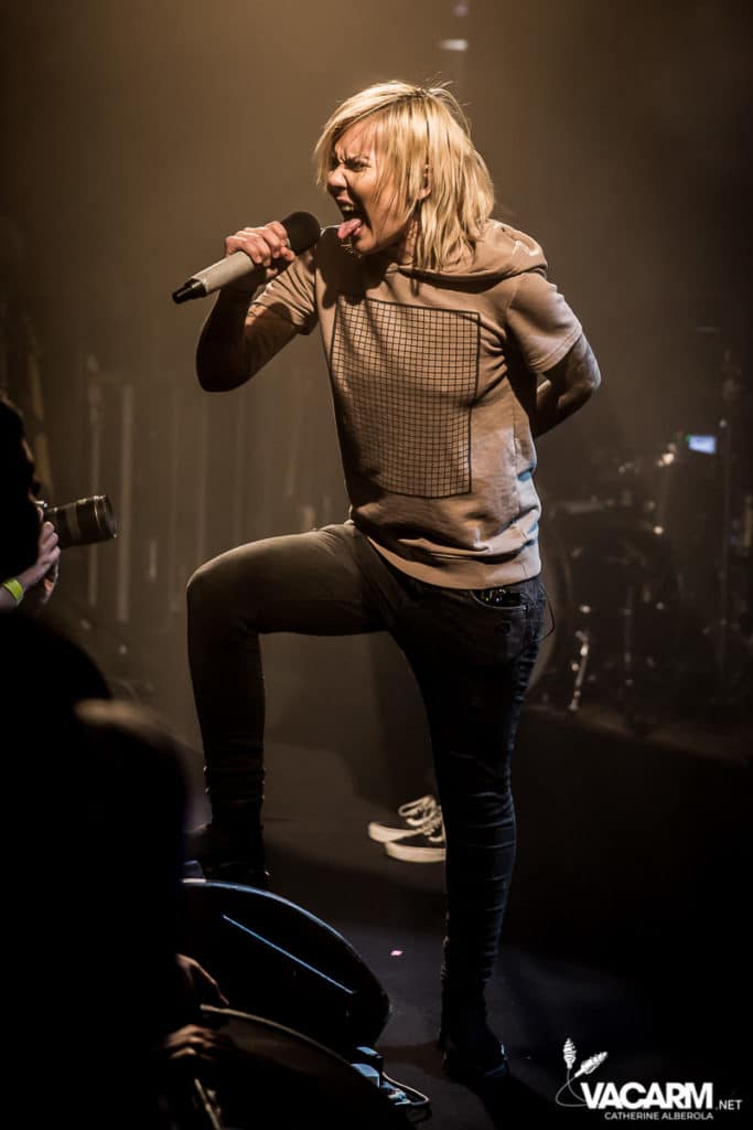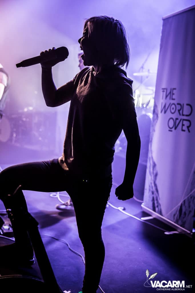 La soirée commence avec le groupe The World Over, venu de Los Angeles, dont le petit bout de chanteuse, Tiaday Ball, ne va pas ménager sa peine pour insuffler de l’énergie à la prestation. Parcourant la scène sans relâche, n’hésitant pas à grimper sur les amplis, allant constamment au contact du public, la petite blonde aux faux airs de Debbie Harry n’a aucun mal à conquérir le public du Trabendo. Tiaday Ball alterne chant clair et scream bien grave tandis que les musiciens délivrent un metal post hardcore puissant. Une explosion de décibels et une chanteuse survitaminée pour une trentaine de minutes qui passent bien trop vite. Un bémol et c’est souvent le cas ces derniers temps au Trabendo, le son n’est vraiment pas à la hauteur et il faut tendre l’oreille pour entendre le chant clair de la demoiselle.