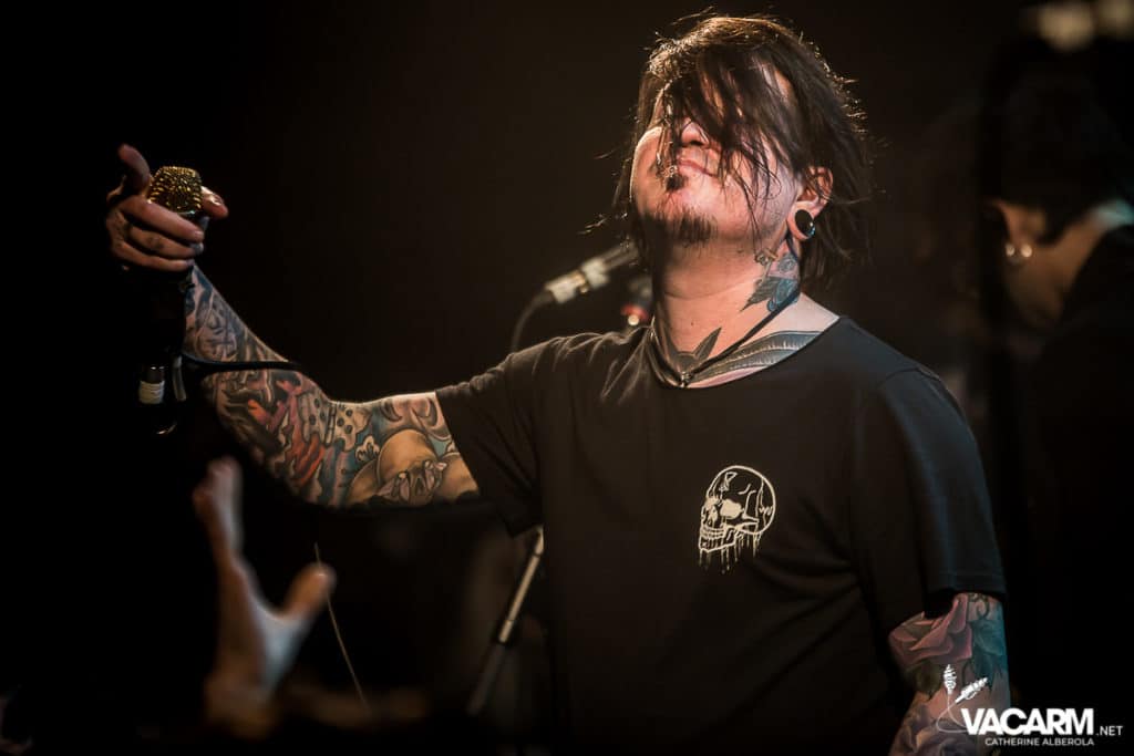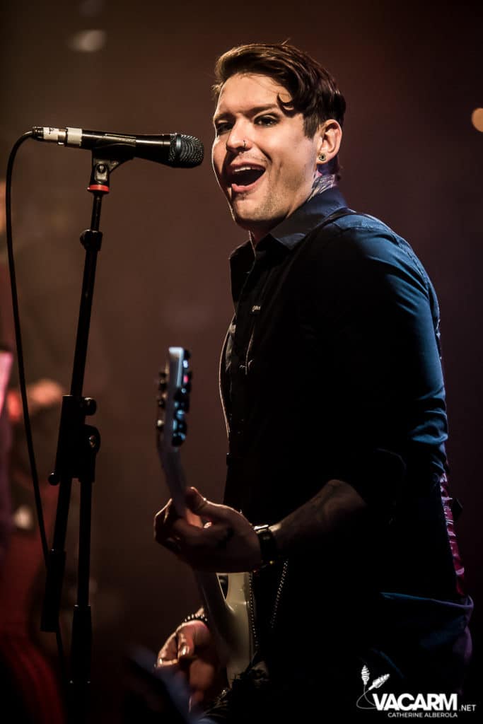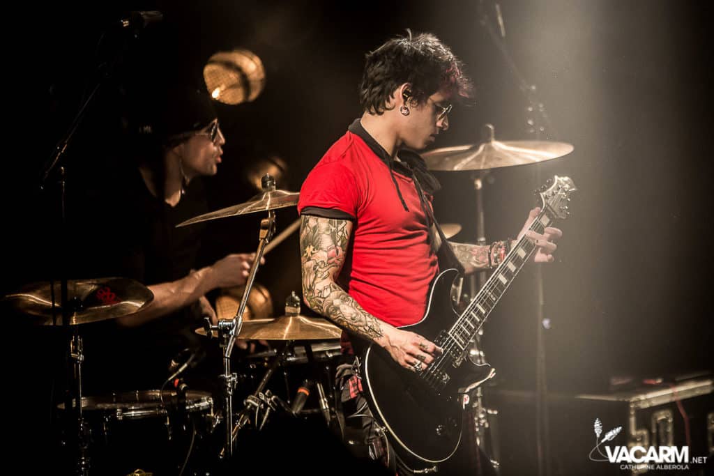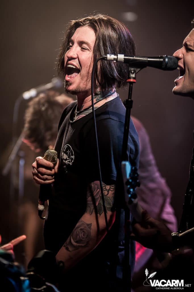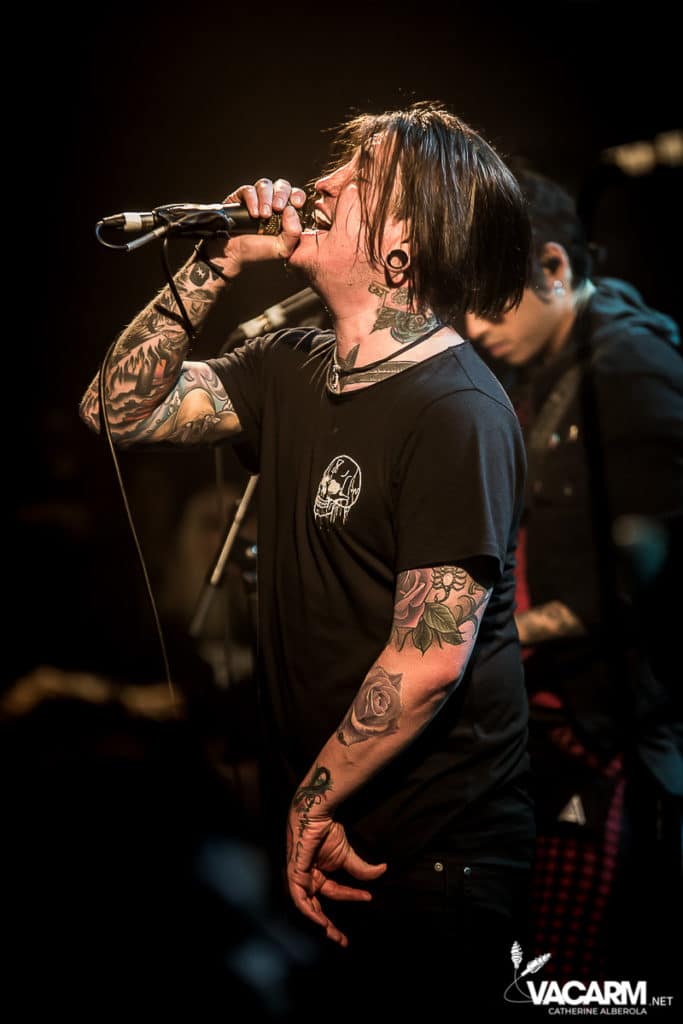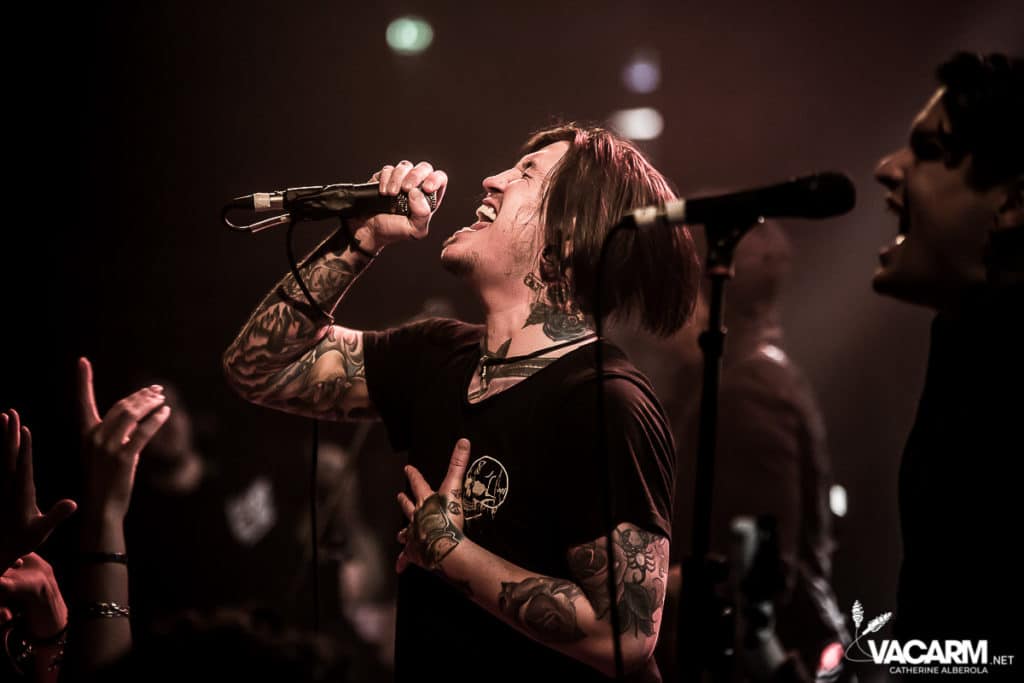 Il faut patienter jusqu’à 21h30 pour voir enfin arriver la tête d’affiche. Même si Escape the Fate se produit régulièrement à Paris, cette tournée est un peu particulière puisqu’il s’agit de fêter les 10 ans de l’album mythique du groupe, This War Is Ours, celui qui a marqué toute une génération de jeunes emos. Lorsque les lumières s’éteignent c’est bizarrement avec la version intégrale de « Bohemian Rhapsody » de Queen que le concert commence si on peut dire. Certes l’hymne est repris en choeur par le public du Trabendo (moi inclus) mais je ne vois pas trop l’intérêt de débuter un concert ainsi, d’autant que le titre est assez long. Bref, après ces 5 minutes d’attente supplémentaires, le groupe débarque enfin sur la scène du Trabendo pour reprendre, dans l’ordre de l’album, les 11 titres qui ont fait leur gloire, repris à l’unisson par une fosse enchantée et bouillonnante. Craig Mabbitt, le frontman, hyper souriant, ne cesse d’aller au contact du public, de serrer des mains tandis que Kevin Gruft, le guitariste, fait son show avec ses sauts et tirages de langue. Dix ans après, la magie opère encore même si certains dans la fosse semblent si jeunes qu’ils ont dû découvrir l’album bien après sa sortie, preuve que This War Is Ours est entré dans l’histoire des albums de légende et sera découvert par d’autres générations encore dans le futur. Emocore is not dead !
