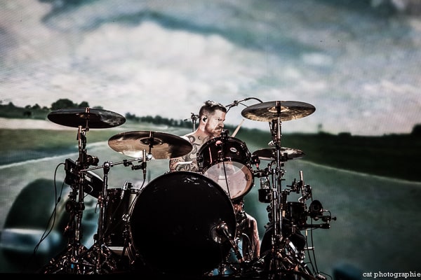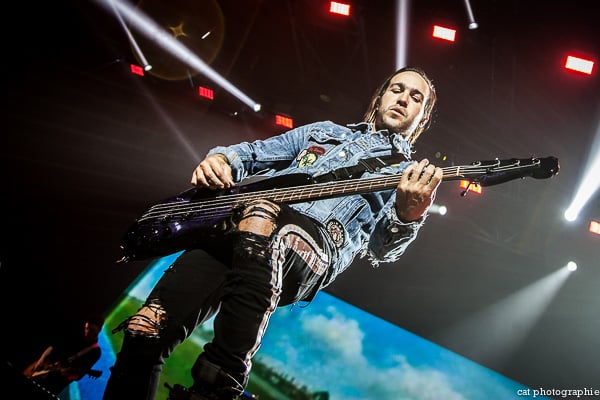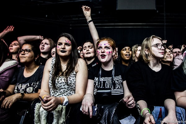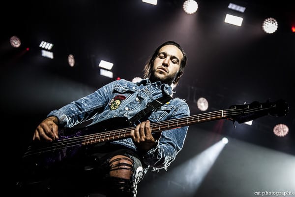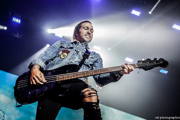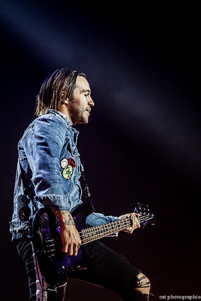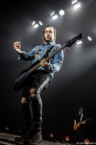 Le concert de la tête d’affiche ne démarrant qu’à 21h45, j’ai craint un moment que Fall Out Boy ne propose un set un peu raccourci mais le groupe va enchaîner plus d’une vingtaine de titres dont sept tirés de son 7e et dernier opus MANIA sorti en janvier 2018. Le groupe s’est quelque peu éloigné du punk hardcore de ses débuts pour prendre un virage plus pop. Sur scène, les grands moyens sont déployés avec pyrotechnie, écran géant diffusant de somptueux visuels dont on retiendra notamment un live-stream du jeu Overwatch, une rétrospective de la vie de Lady Di sur “Champion”, des dizaines de majeurs levés sur “I don’t care” ou encore des images cultissimes de Kill Bill de Tarentino sur “Uma Thurman”. Joe Trohman (guitare), absent de cette tournée, étant remplacé, Pete Wentz (basse), prend encore plus d’importance sur scène. Rappelons qu’il est une pièce maîtresse du groupe puisque c’est lui qui compose la plupart des titres, sa bipolarité expliquant d’ailleurs certains des textes. Scéniquement aussi, c’est lui qui apporte le petit plus nécessaire au live, hors effets visuels ou autres moyens techniques. En milieu de set, après une jolie version au piano de “Young and Menace”, le très tatoué Andy Hurley nous offre un magnifique solo de batterie et Pete Wentz (vêtu pour l’occasion d’un gilet de sécurité jaune !) va grimper sur une mini-scène descendue au milieu de la fosse le temps de l’accueillir puis jouer perché pendant un moment. Les côtés de cette mini-scène sont des écrans géants et c’est du plus bel effet ! Le public du Zénith saute et vibre à l’unisson et sur certains titres cultes comme “Centuries” notamment, le sol du Zénith va considérablement trembler ! Fort de ses 17 ans de carrière, Fall Out Boy propose un show magnifique et fait danser la fosse pendant une heure trente. Le concert se termine avec une pluie de confettis sur “Saturday” et un Pete Wentz bondissant, vêtu d’un tee-shirt Fly Emirates qui va s’offrir un bain de foule dans la fosse au milieu des fans hystériques. Les meilleures choses ont une fin, sur l’écran géant s’affiche “Maybe it was just a dream” et c’est sur la voix des Everly Brothers et de leur titre culte “All I Have To Do Is Dream » que le Zénith va se vider.