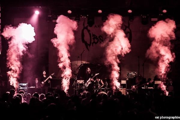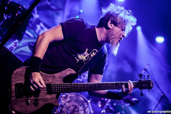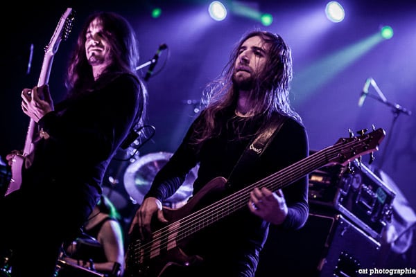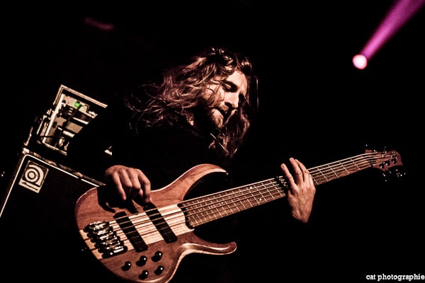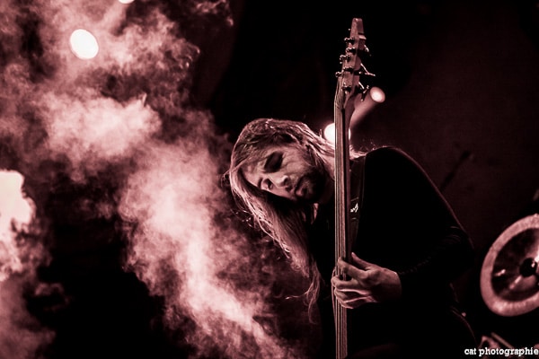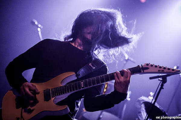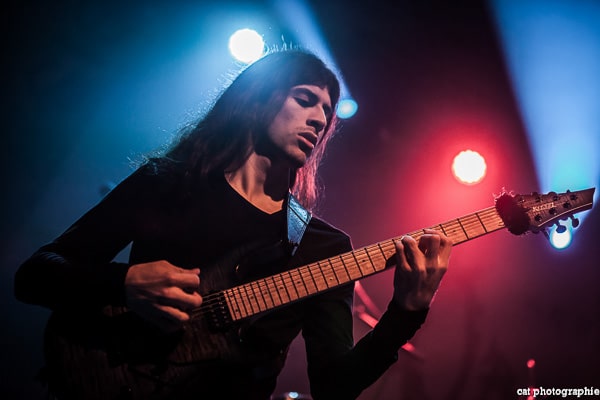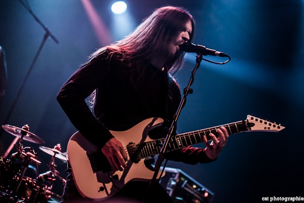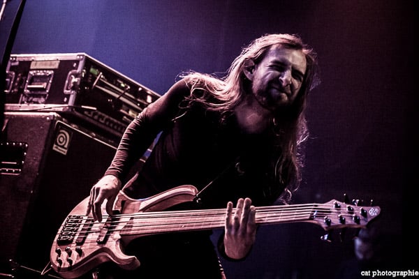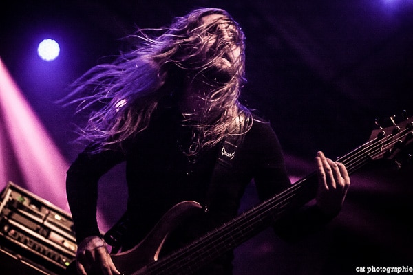 Malheureusement, avec quatre groupes, la soirée a débuté très tôt et je n’ai pu voir la prestation des deux premiers, Goatwhore et Fit For An Autopsy. C’est donc avec le groupe de death metal allemand Obscura que la soirée démarre pour moi. Le groupe a l’air très attendu par une partie du public qui semble avoir fait le déplacement tout spécialement pour voir les allemands. Pour les photos c’est raté, du rouge, du noir, de la fumée, le pire du pire pour un photographe de concert ! Côté son malheureusement, ce n’est pas vraiment top, dommage. Ces petits désagréments mis à part, la prestation du groupe semble appréciée des amateurs du genre et c’est l’essentiel. Le dernier album d’Obscura, Akroasis, date un peu, puisque sorti en 2016. Le frontman, Steffen Kummerer, est le seul survivant de la formation d’origine. Rafael Trujillo, le guitariste, peu expressif, excelle dans les solos et Linus Klausenitzer à la basse assure le show visuel en bougeant, grimaçant, souriant aux photographes, il sera du coup sur-représenté sur les photos ! Le public se dégèle et la température commence à grimper, le set est un peu court (6 titres), les fans devront attendre certainement la sortie d’un nouvel album pour retrouver Obscura en tête d’affiche.