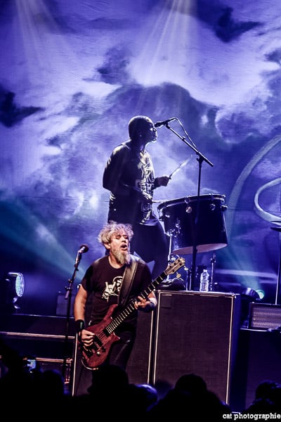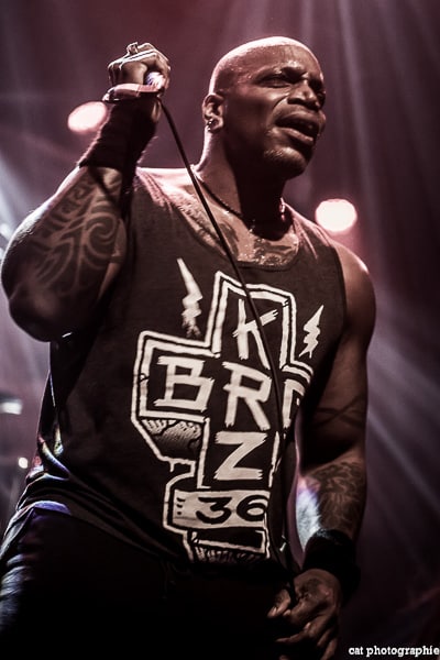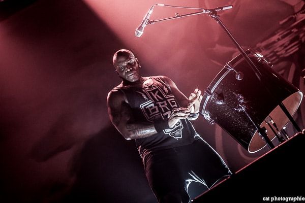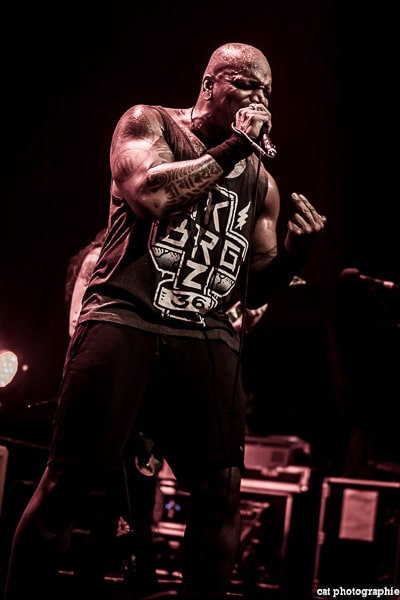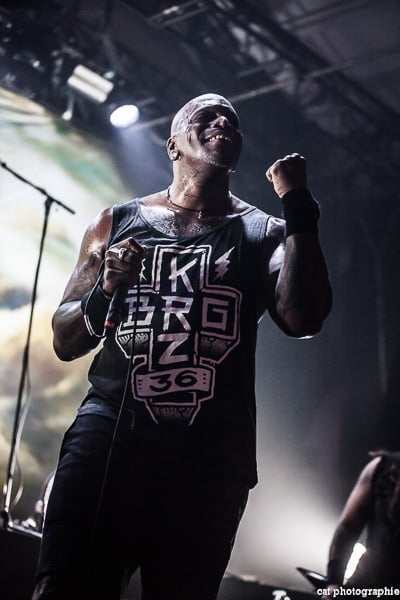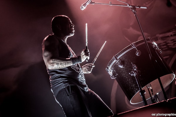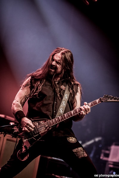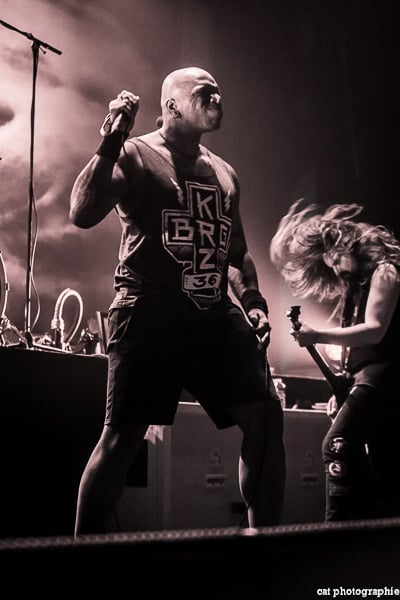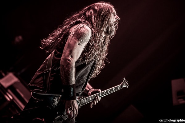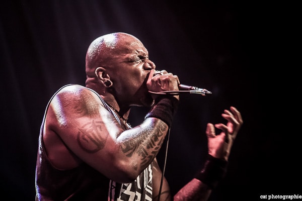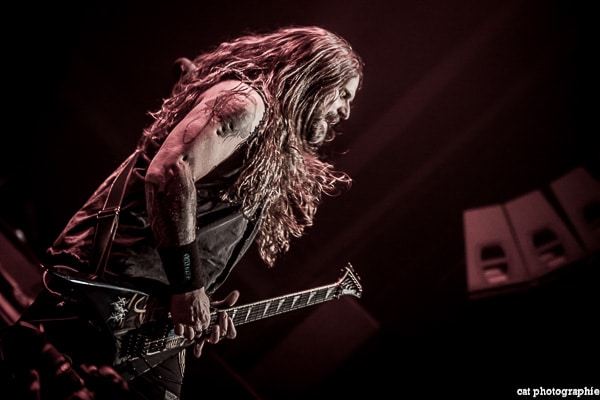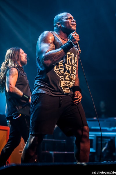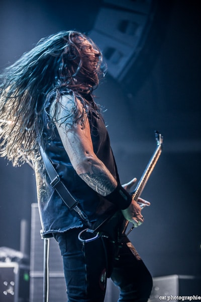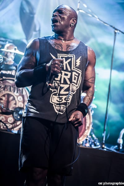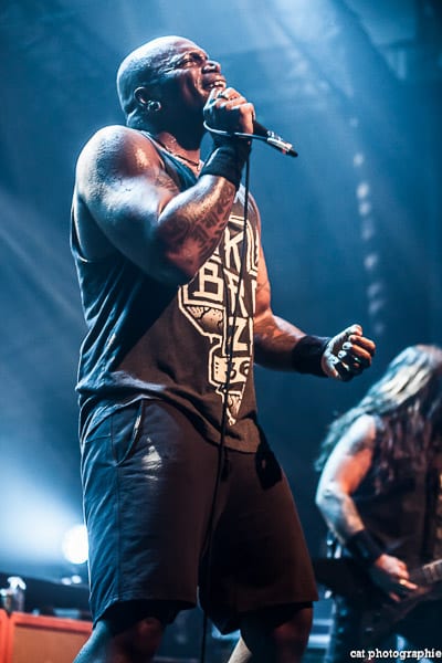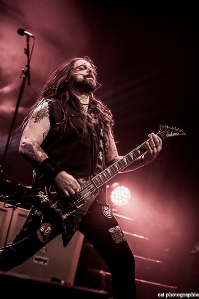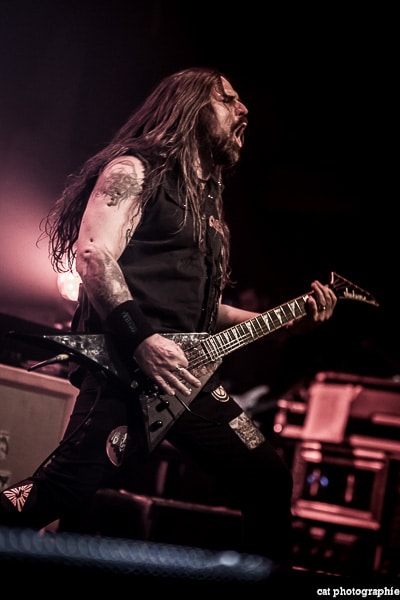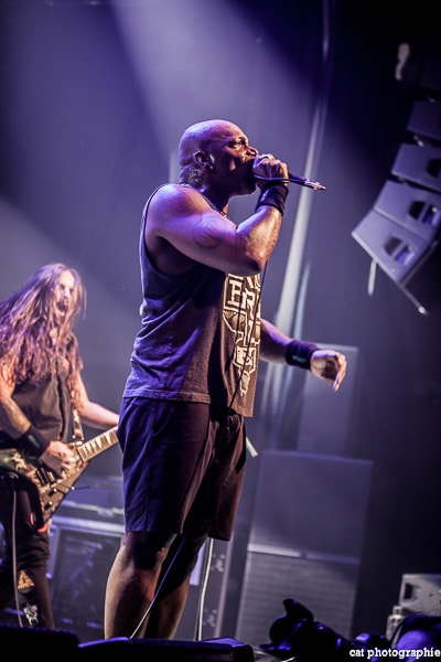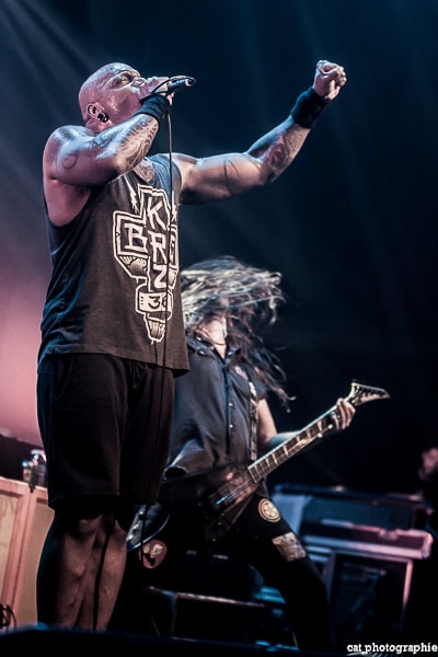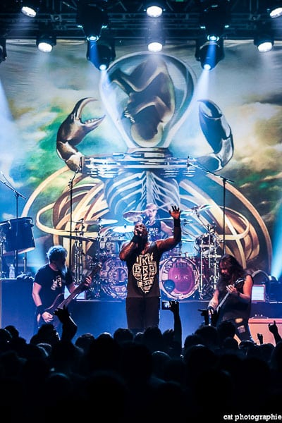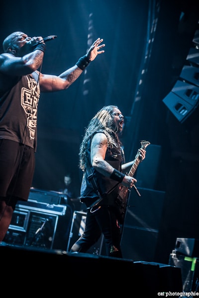 Côté son, soulagement, c’est parfait, la balance a dû privilégier la tête d’affiche ! On ne va pas refaire l’histoire, Sepultura a connu un succès immense avec les frères Cavalera, à l’origine du groupe, mais la vie est ainsi faite qu’il ne reste que Paulo Jr (basse) du line-up d’origine (34 ans de fidélité !), le guitariste Andreas Kisser le suivant de près avec 31 ans de riffs enragés au service du groupe. Les brésiliens ont depuis 20 ans un frontman américain, Derrick Green, géant hyper musclé à la voix grave et profonde. L’an dernier, en première partie de Kreator au Bataclan, Sepultura ne disposait que d’une partie de la scène, gêné par l’imposant matériel de la tête d’affiche. Ce soir, le groupe peut prend pleinement possession de la scène pour le plus grand bonheur d’un public totalement acquis à sa cause même si on regrette que le concert ne soit pas complet. Dès le premier titre, Andreas Kisser fait une démonstration de son immense talent de guitariste. Quelle claque ! Et avec le sourire en plus ! Charismatique en diable, il ne cesse d’aller vers le public et offre, outre des solos incroyables, un spectacle visuel fort sympathique. La session basse/batterie est d’une qualité irréprochable, complétée par moments par Derrick aux percussions. La voix du frontman vous remue jusqu’aux entrailles. C’est un concert de très grande qualité auquel le public de l’Elysée Montmartre assiste ce soir et il va manifester son contentement en pogotant, slammant, headbanguant etc , frisant l’hystérie sur les tubes les plus anciens comme “Territory” ou “Refuse/Resist” et bien entendu, au rappel, les titres emblématiques “Ratamahatta” et “Roots Bloody Roots”. Même si la ferveur culmine sur ces anciens titres, l’engouement pour le groupe est bien là, y compris sur les titres de l’ère d’après, celle sans le frontman d’origine. Sepultura est assurément un groupe de scène, offrant un concert d’une heure trente sans aucun temps mort et une vraie performance tant les musiciens sont excellents d’un bout à l’autre, tout en ayant l’air sincèrement heureux d’être sur scène. C’est une de ces soirées magiques dont on ressort lessivés mais reboostés, en attendant la prochaine.